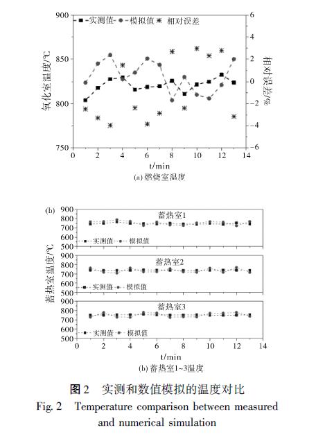 在連續(xù)監(jiān)測穩(wěn)定運(yùn)行階段多個(gè)切換周期后, 將燃燒室三個(gè)熱電偶及變送器監(jiān)測的爐膛溫度值計(jì)算得到平均值, 同時(shí)將每個(gè)蓄熱室中的出口位置熱電偶的溫度值進(jìn)行記錄, 圖2 為同一測點(diǎn)的工程實(shí)際數(shù)據(jù)與數(shù)值模擬值的對比。通過對比, 得到溫度模擬數(shù)據(jù)與實(shí)際監(jiān)測值的相對誤差均在4% 以內(nèi), 這也可能