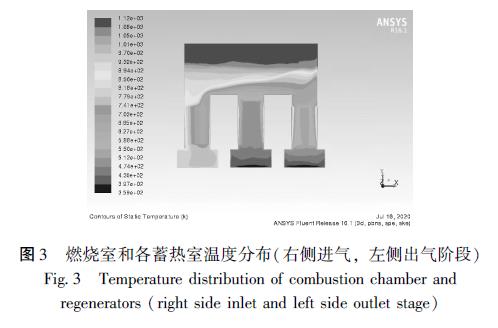 量, 因此在豎直方向蓄熱體和氣體都呈現(xiàn)出明顯的溫度梯度。同時(shí), 當(dāng)進(jìn)氣排氣方向發(fā)生變化時(shí), 燃燒室內(nèi)溫度也會(huì)出現(xiàn)波動(dòng), 且分布不均勻。對于燃燒室結(jié)構(gòu), 也有裝置將燃燒室頂部兩側(cè)的直角改為切角, 使得煙氣湍流充分, 減小低溫區(qū)出現(xiàn)的可能性