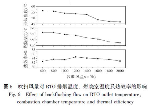 吹掃過程是通過吹掃風(fēng)機(jī)將殘留在蓄熱室內(nèi)的VOCs 帶入燃燒室, 以提高廢氣的效率[11] 。但目前RTO 反吹風(fēng)量的設(shè)計(jì)大多基于工程經(jīng)驗(yàn), 對不同工況下的實(shí)際運(yùn)行參考性不高。為了研究吹掃風(fēng)量對RTO 裝置運(yùn)行的影響, 試驗(yàn)設(shè)定在廢氣流量8000 m3 / h, 切換時(shí)間2 min 且無電加熱的條件下, 模擬吹掃風(fēng)量從600 m3 / h 增加到2000 m3 / h 時(shí)出口溫度、燃燒室溫度和熱效率變化情況。如圖6 所示。由于吹掃風(fēng)是從排至煙囪的煙氣中抽取, 實(shí)際吹掃風(fēng)中含有的VOCs 濃度較低, 無法給燃燒室提供多的。同時(shí), 過大的吹掃風(fēng)量增加了進(jìn)入進(jìn)氣和排氣蓄熱室的流量, 降低了實(shí)際發(fā)生氧化反應(yīng)的廢氣的預(yù)熱溫度, 且降低了出口溫度。雖然熱效率在1200 m3 / h 吹掃風(fēng)量附近有一定程度的增加, 但結(jié)合燃燒室溫度和經(jīng)濟(jì)因素,800 ~1000 m3 / h 區(qū)間內(nèi)較為合理與實(shí)際工程經(jīng)驗(yàn)吹掃風(fēng)量占進(jìn)氣流量的10% 左右結(jié)論相近[12] 。同時(shí)可以看出, 吹掃風(fēng)量越大, 燃燒室的溫度越低, 需要開啟電加熱器提供熱量來提高燃燒室的溫度, 增加運(yùn)行成本。